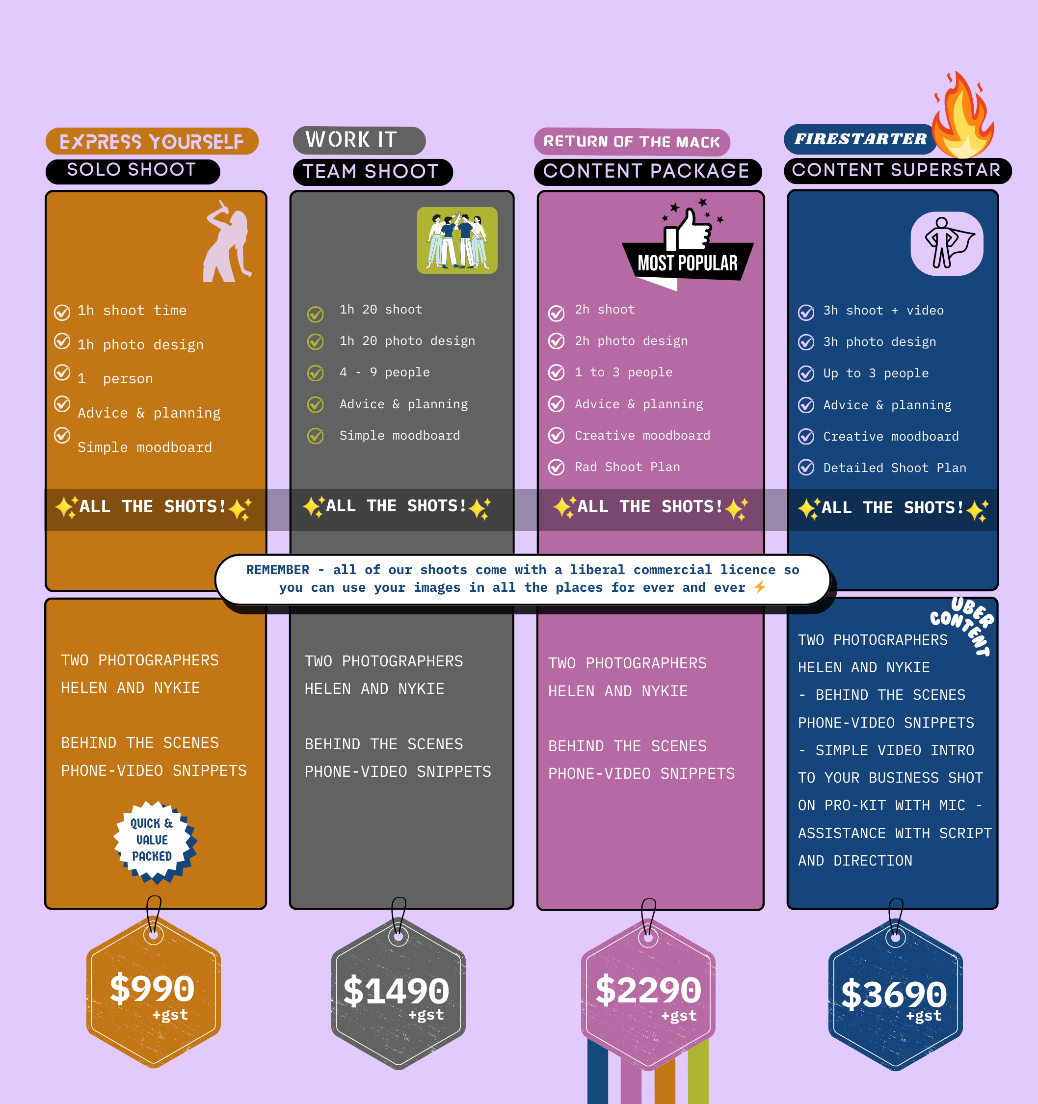 But what is not mean, is that we are giving you ALL THE SHOTS. If you’re on a shoot with us & you want extra time and it suits us, we will stay on. Extra images will be charged for according to how long we stayed. (IE: No Scrubs package is $990 per hour.